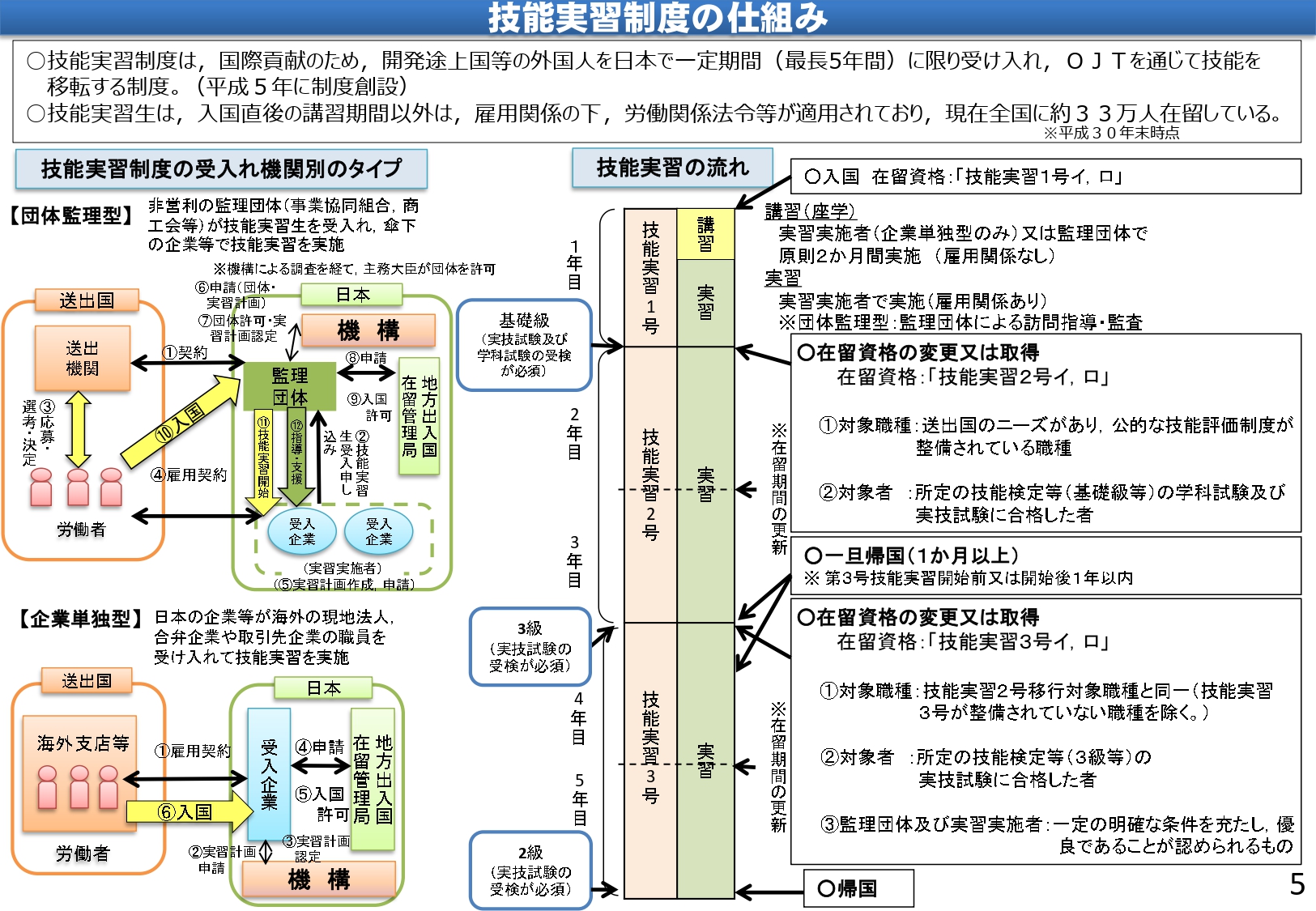 | 平成22年7月 | 出入国管理及び難民認定法の改正。①実務研修を行う場合に雇用契約に基づいて技能等を修得する活動を行うことの義務化、②在留資格「技能実習」の創設 |